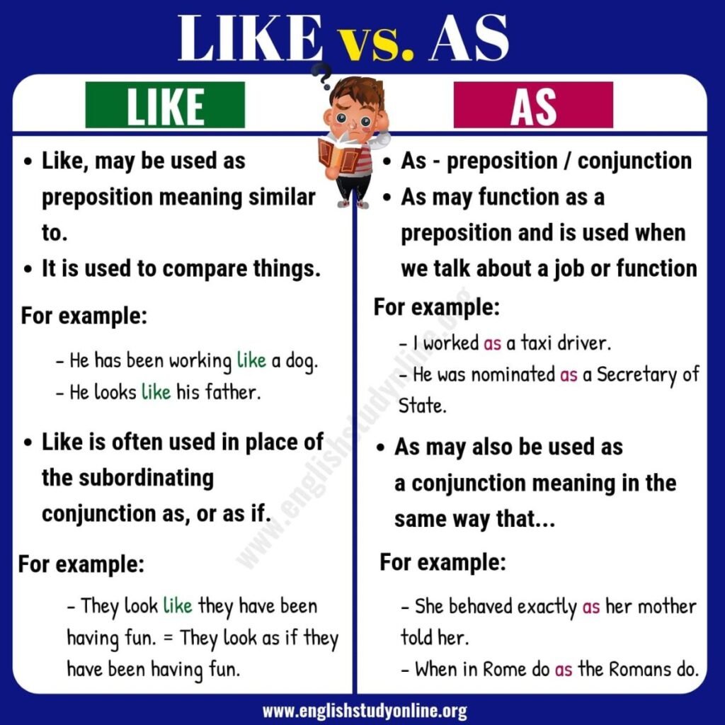 - English learners often search “like or as grammar rule” to clarify the difference.